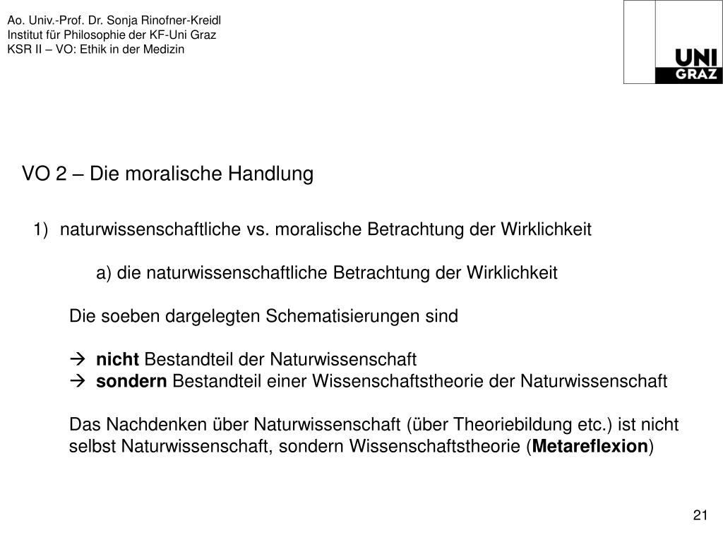 Ao. Univ.-Prof. Dr. Sonja Rinofner-KreidlInstitut für Philosophie der KF-Uni GrazKSR II – VO: Ethik in der Medizin VO 2 – Die moralische Handlung • naturwissenschaftliche vs. moralische Betrachtung der Wirklichkeit • a) die naturwissenschaftliche Betrachtung der Wirklichkeit Die soeben dargelegten Schematisierungen sind • nicht Naturwissenschaft • sondern Wissenschaftstheorie der Naturwissenschaft 20