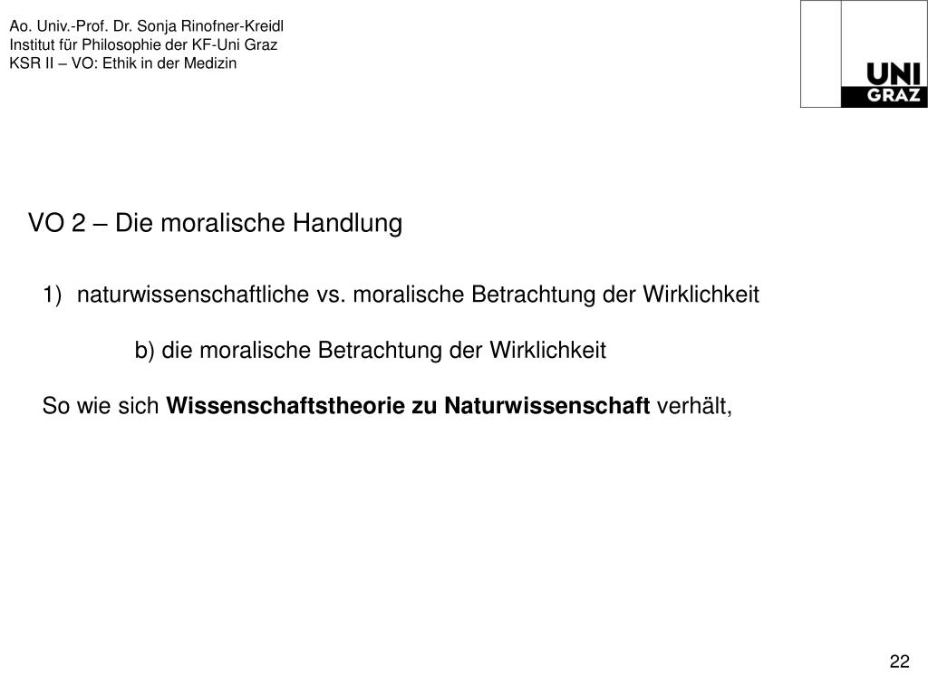 Ao. Univ.-Prof. Dr. Sonja Rinofner-KreidlInstitut für Philosophie der KF-Uni GrazKSR II – VO: Ethik in der Medizin VO 2 – Die moralische Handlung • naturwissenschaftliche vs. moralische Betrachtung der Wirklichkeit • b) die moralische Betrachtung der Wirklichkeit • So wie sich Wissenschaftstheorie zu Naturwissenschaft verhält, 22