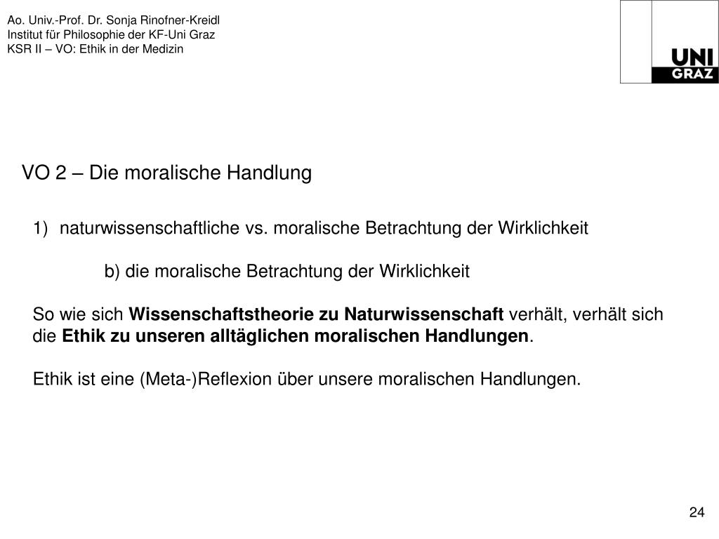 Ao. Univ.-Prof. Dr. Sonja Rinofner-KreidlInstitut für Philosophie der KF-Uni GrazKSR II – VO: Ethik in der Medizin VO 2 – Die moralische Handlung • naturwissenschaftliche vs. moralische Betrachtung der Wirklichkeit • b) die moralische Betrachtung der Wirklichkeit • So wie sich Wissenschaftstheorie zu Naturwissenschaft verhält, so verhält sich • die Ethik zu unseren alltäglichen moralischen Handlungen. 23