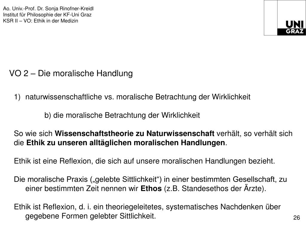 Ao. Univ.-Prof. Dr. Sonja Rinofner-KreidlInstitut für Philosophie der KF-Uni GrazKSR II – VO: Ethik in der Medizin VO 2 – Die moralische Handlung • naturwissenschaftliche vs. moralische Betrachtung der Wirklichkeit • b) die moralische Betrachtung der Wirklichkeit • So wie sich Wissenschaftstheorie zu Naturwissenschaft verhält, verhält sich • die Ethik zu unseren alltäglichen moralischen Handlungen. • Ethik ist eine (Meta-)Reflexion über unsere moralischen Handlungen. • Die moralische Praxis in einer bestimmten Gesellschaft, zu einer bestimmten Zeit • nennen wir Ethos (z.B. Standesethos der Ärzte). 25