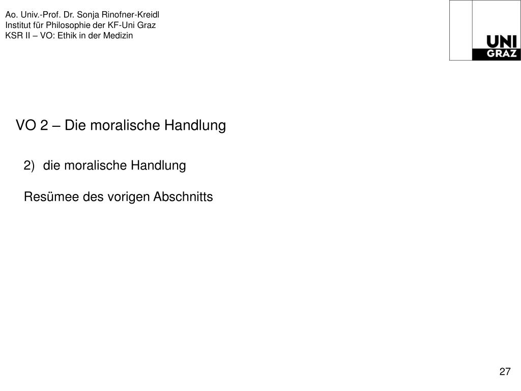 Ao. Univ.-Prof. Dr. Sonja Rinofner-KreidlInstitut für Philosophie der KF-Uni GrazKSR II – VO: Ethik in der Medizin VO 2 – Die moralische Handlung • 2) die moralische Handlung • Resümee des vorigen Abschnitts 27