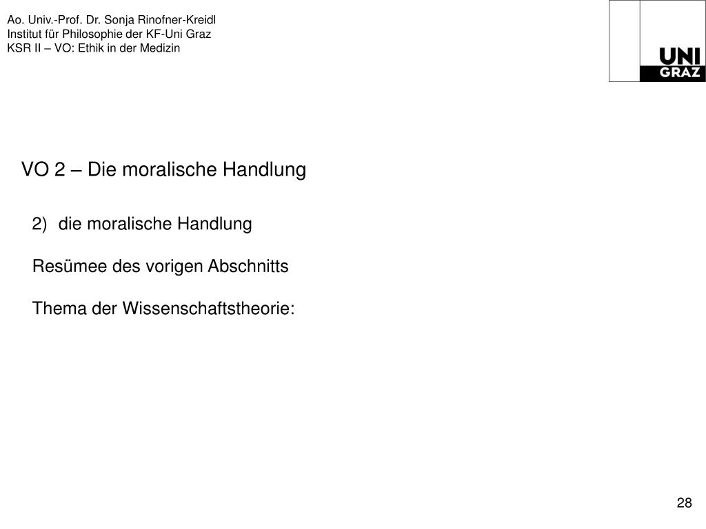 Ao. Univ.-Prof. Dr. Sonja Rinofner-KreidlInstitut für Philosophie der KF-Uni GrazKSR II – VO: Ethik in der Medizin VO 2 – Die moralische Handlung • 2) die moralische Handlung • Resümee des vorigen Abschnitts • Thema der Wissenschaftstheorie: 28