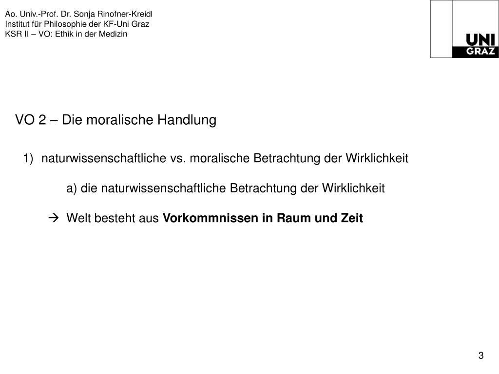 Ao. Univ.-Prof. Dr. Sonja Rinofner-KreidlInstitut für Philosophie der KF-Uni GrazKSR II – VO: Ethik in der Medizin VO 2 – Die moralische Handlung • naturwissenschaftliche vs. moralische Betrachtung der Wirklichkeit • a) die naturwissenschaftliche Betrachtung der Wirklichkeit 2