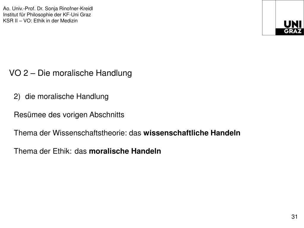 Ao. Univ.-Prof. Dr. Sonja Rinofner-KreidlInstitut für Philosophie der KF-Uni GrazKSR II – VO: Ethik in der Medizin VO 2 – Die moralische Handlung • 2) die moralische Handlung • Resümee des vorigen Abschnitts • Thema der Wissenschaftstheorie: das wissenschaftliche Handeln • Thema der Ethik: 30