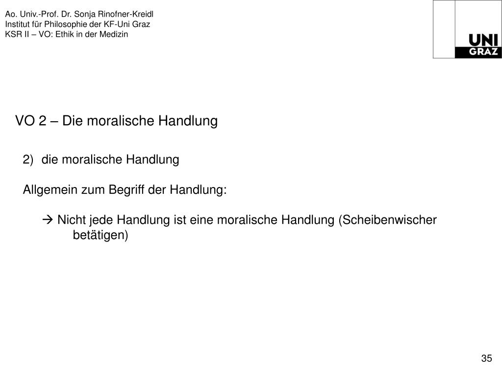 Ao. Univ.-Prof. Dr. Sonja Rinofner-KreidlInstitut für Philosophie der KF-Uni GrazKSR II – VO: Ethik in der Medizin VO 2 – Die moralische Handlung • 2) die moralische Handlung • Allgemein zum Begriff der Handlung: • Nicht jede Handlung ist eine moralische Handlung (Scheibenwischer betätigen) 35