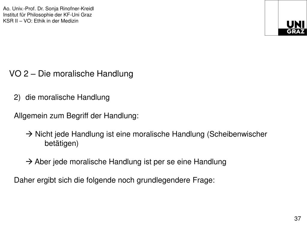 Ao. Univ.-Prof. Dr. Sonja Rinofner-KreidlInstitut für Philosophie der KF-Uni GrazKSR II – VO: Ethik in der Medizin VO 2 – Die moralische Handlung • 2) die moralische Handlung • Allgemein zum Begriff der Handlung: • Nicht jede Handlung ist eine moralische Handlung (Scheibenwischer betätigen) • Aber jede moralische Handlung ist per se eine Handlung 36