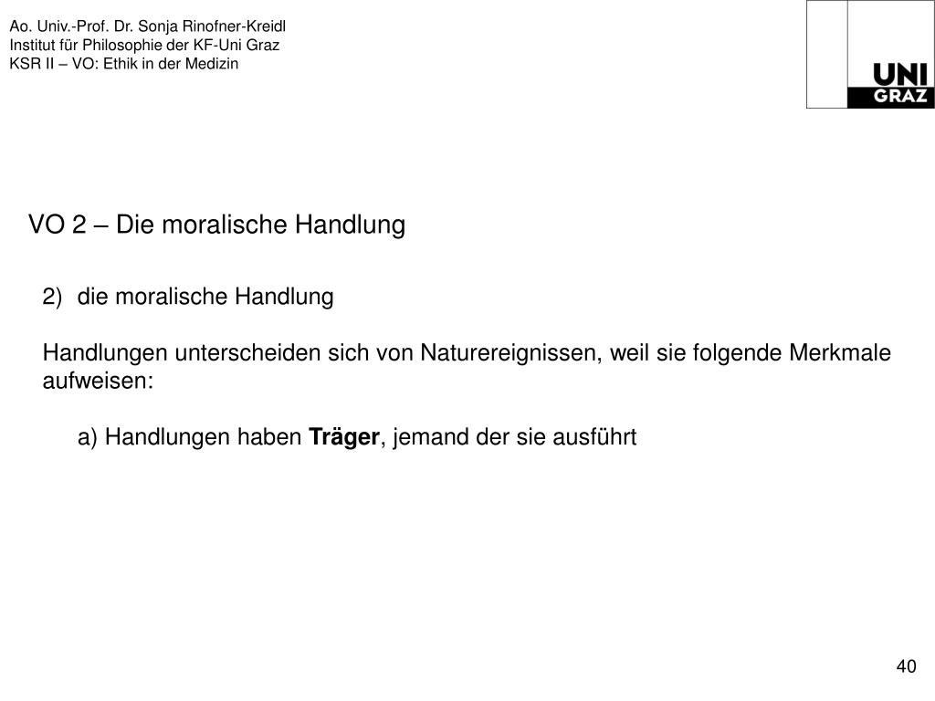 Ao. Univ.-Prof. Dr. Sonja Rinofner-KreidlInstitut für Philosophie der KF-Uni GrazKSR II – VO: Ethik in der Medizin VO 2 – Die moralische Handlung • 2) die moralische Handlung • Handlungen unterscheiden sich von Naturereignissen, weil sie folgende Merkmale • aufweisen: 39