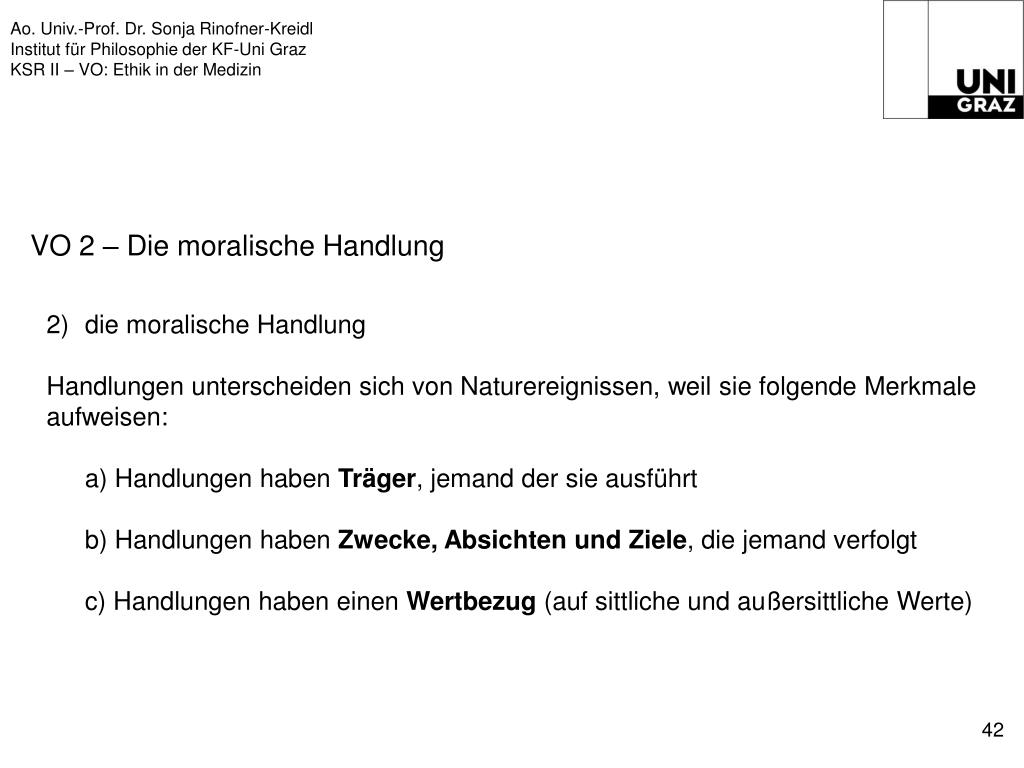 Ao. Univ.-Prof. Dr. Sonja Rinofner-KreidlInstitut für Philosophie der KF-Uni GrazKSR II – VO: Ethik in der Medizin VO 2 – Die moralische Handlung • 2) die moralische Handlung • Handlungen unterscheiden sich von Naturereignissen, weil sie folgende Merkmale • aufweisen: • a) Handlungen haben Träger, jemand der sie ausführt • b) Handlungen haben Zwecke, Absichten und Ziele, die jemand verfolgt 41
