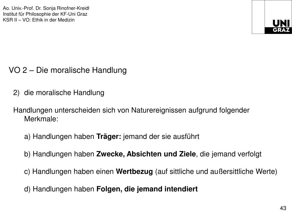 Ao. Univ.-Prof. Dr. Sonja Rinofner-KreidlInstitut für Philosophie der KF-Uni GrazKSR II – VO: Ethik in der Medizin VO 2 – Die moralische Handlung • 2) die moralische Handlung • Handlungen unterscheiden sich von Naturereignissen, weil sie folgende Merkmale • aufweisen: • a) Handlungen haben Träger, jemand der sie ausführt • b) Handlungen haben Zwecke, Absichten und Ziele, die jemand verfolgt • c) Handlungen haben einen Wertbezug (auf sittliche und außersittliche Werte) 42