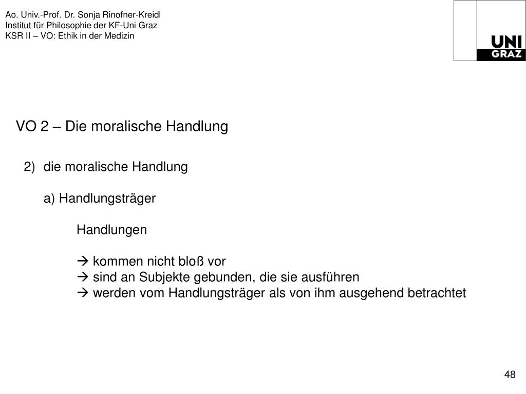Ao. Univ.-Prof. Dr. Sonja Rinofner-KreidlInstitut für Philosophie der KF-Uni GrazKSR II – VO: Ethik in der Medizin VO 2 – Die moralische Handlung • 2) die moralische Handlung • a) Handlungsträger • Handlungen • kommen nicht bloß vor • sind an Subjekte gebunden, die sie ausführen 47