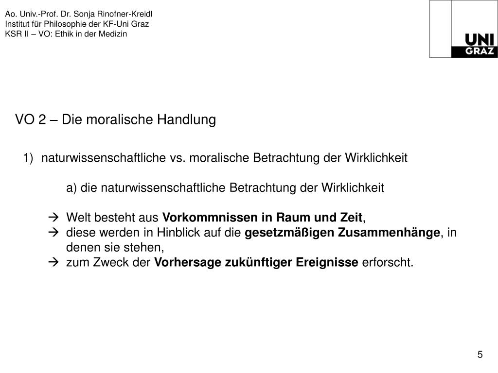 Ao. Univ.-Prof. Dr. Sonja Rinofner-KreidlInstitut für Philosophie der KF-Uni GrazKSR II – VO: Ethik in der Medizin VO 2 – Die moralische Handlung • naturwissenschaftliche vs. moralische Betrachtung der Wirklichkeit • a) die naturwissenschaftliche Betrachtung der Wirklichkeit • Welt besteht aus Vorkommnissen in Raum und Zeit, • diese werden in Hinblick auf die gesetzmäßigen Zusammenhänge, in denen sie stehen, 4