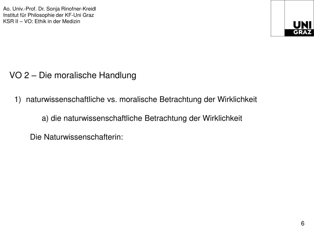 Ao. Univ.-Prof. Dr. Sonja Rinofner-KreidlInstitut für Philosophie der KF-Uni GrazKSR II – VO: Ethik in der Medizin VO 2 – Die moralische Handlung • naturwissenschaftliche vs. moralische Betrachtung der Wirklichkeit • a) die naturwissenschaftliche Betrachtung der Wirklichkeit • Welt besteht aus Vorkommnissen in Raum und Zeit, • diese werden in Hinblick auf die gesetzmäßigen Zusammenhänge, in denen sie stehen, • zum Zweck der Vorhersage zukünftiger Ereignisse erforscht. 5