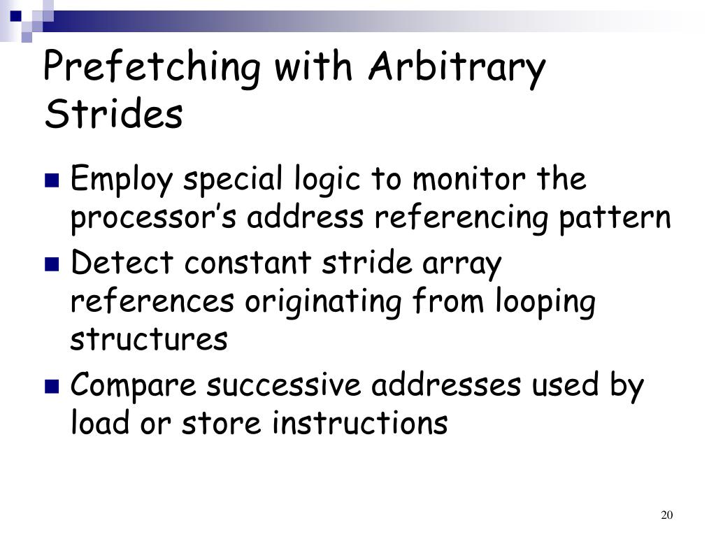 Prefetching with Arbitrary Strides • Employ special logic to monitor the processor’s address referencing pattern • Detect constant stride array references originating from looping structures • Compare successive addresses used by load or store instructions