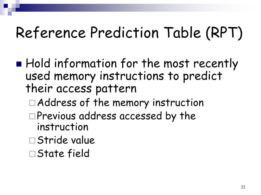 Reference Prediction Table (RPT) • Hold information for the most recently used memory instructions to predict their access pattern • Address of the memory instruction • Previous address accessed by the instruction • Stride value • State field
