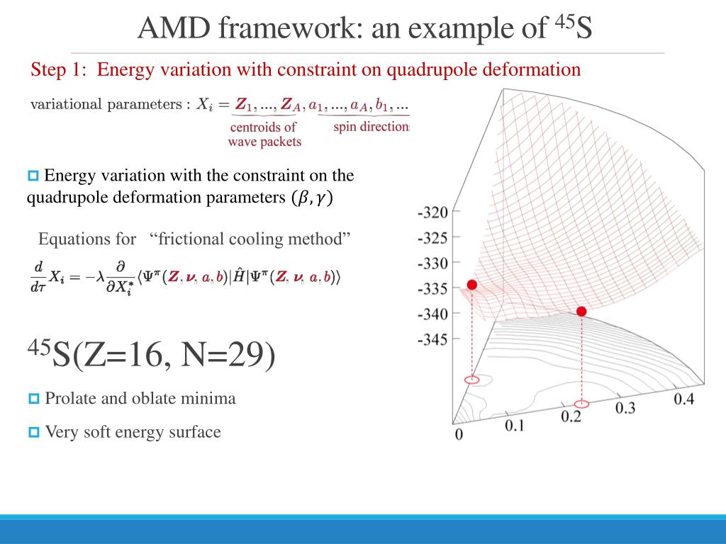 AMD framework: an example of 45S Step 1: Energy variation with constraint on quadrupole deformation 45S(Z=16, N=29) • Prolate and oblate minima • Very soft energy surface • Energy variation with the constraint on the quadrupole deformation parameters Equations for “frictional cooling method”