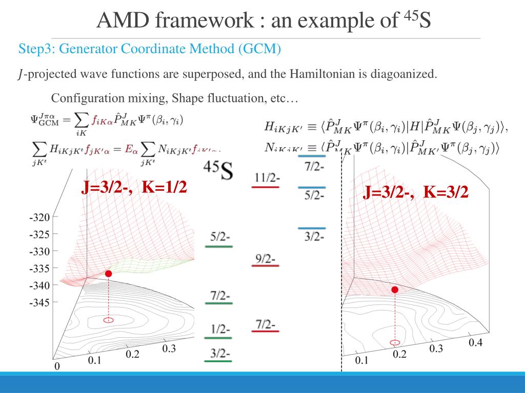 AMD framework : an example of 45S • Step3: Generator Coordinate Method (GCM) • -projected wave functions are superposed, and the Hamiltonian is diagoanized. • Configuration mixing, Shape fluctuation, etc… J=3/2-, K=1/2 J=3/2-, K=3/2