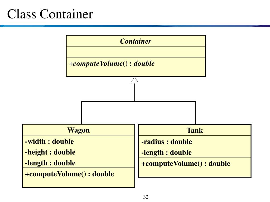 Container +computeVolume() : double Wagon Tank -width : double -height : double -length : double -radius : double -length : double +computeVolume() : double +computeVolume() : double Class Container