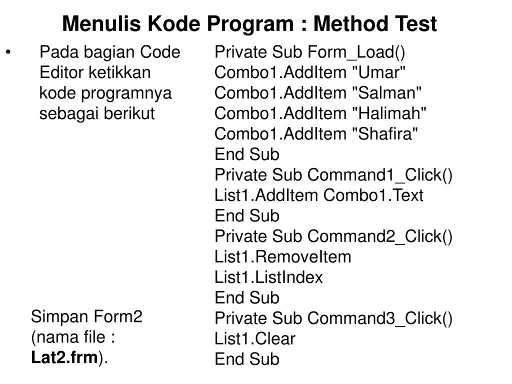 Menulis Kode Program : Method Test Private Sub Form_Load() Combo1.AddItem "Umar" Combo1.AddItem "Salman" Combo1.AddItem "Halimah" Combo1.AddItem "Shafira" End Sub Private Sub Command1_Click() List1.AddItem Combo1.Text End Sub Private Sub Command2_Click() List1.RemoveItem List1.ListIndex End Sub Private Sub Command3_Click() List1.Clear End Sub • Pada bagian Code Editor ketikkan kode programnya sebagai berikut Simpan Form2 (nama file : Lat2.frm).