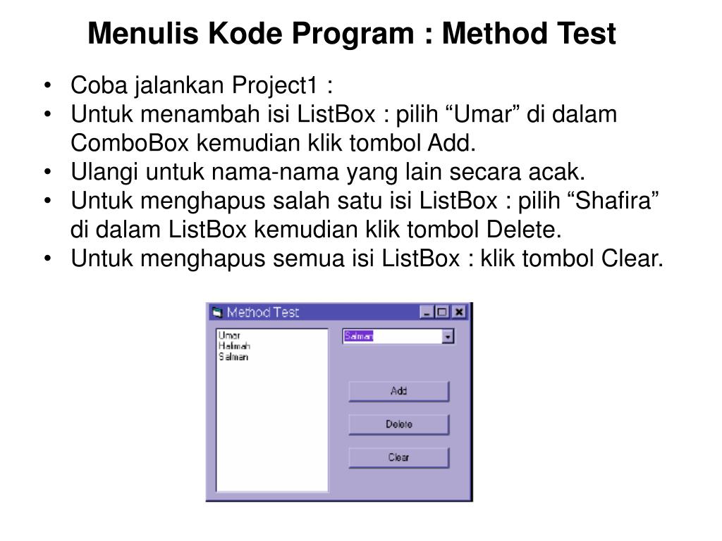 Menulis Kode Program : Method Test Private Sub Form_Load() Combo1.AddItem "Umar" Combo1.AddItem "Salman" Combo1.AddItem "Halimah" Combo1.AddItem "Shafira" End Sub Pada saat Form2 di-load ke dalam memori komputer, object Combo1 diisi dengan beberapa nama. Private Sub Command1_Click() List1.AddItem Combo1.Text End Sub Ketika seorang user meng-klik tombol Add (object Command1) maka isi object List1 ditambah sesuai dengan isi object Combo1 yang sudah dipilih.