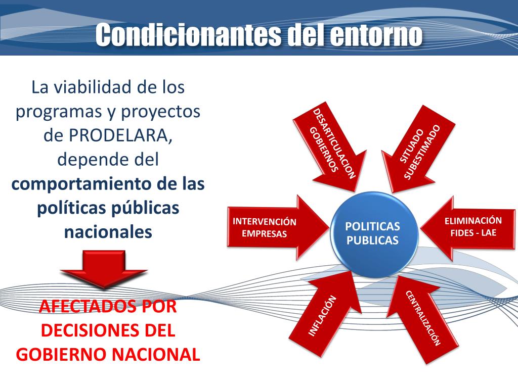 Condicionantes del entorno La viabilidad de los programas y proyectos de PRODELARA, depende del comportamiento de las políticas públicas nacionales SITUADO SUBESTIMADO POLITICAS PUBLICAS ELIMINACIÓN FIDES - LAE DESARTICULACION GOBIERNOS INTERVENCIÓN EMPRESAS CENTRALIZACIÓN AFECTADOS POR DECISIONES DEL GOBIERNO NACIONAL INFLACIÓN