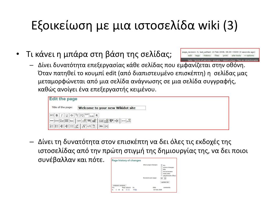 Εξοικείωση με μια ιστοσελίδα wiki (3) • Τι κάνει η μπάρα στη βάση της σελίδας; • Δίνει δυνατότητα επεξεργασίας κάθε σελίδας που εμφανίζεται στην οθόνη. Όταν πατηθεί το κουμπί edit (από διαπιστευμένο επισκέπτη) η σελίδας μας μεταμορφώνεται από μια σελίδα ανάγνωσης σε μια σελίδα συγγραφής, καθώς ανοίγει ένα επεξεργαστής κειμένου. • Δίνει τη δυνατότητα στον επισκέπτη να δει όλες τις εκδοχές της ιστοσελίδας από την πρώτη στιγμή της δημιουργίας της, να δει ποιοι συνέβαλλαν και πότε.