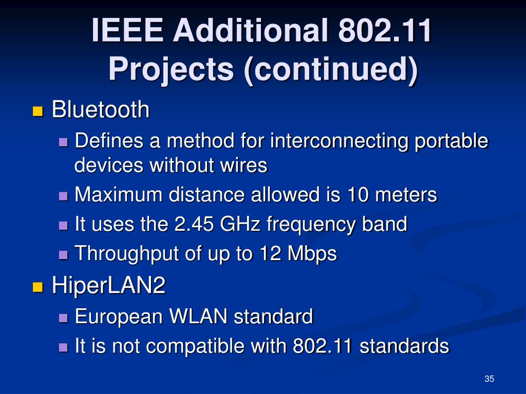 IEEE Additional 802.11 Projects (continued) • Bluetooth • Defines a method for interconnecting portable devices without wires • Maximum distance allowed is 10 meters • It uses the 2.45 GHz frequency band • Throughput of up to 12 Mbps • HiperLAN2 • European WLAN standard • It is not compatible with 802.11 standards