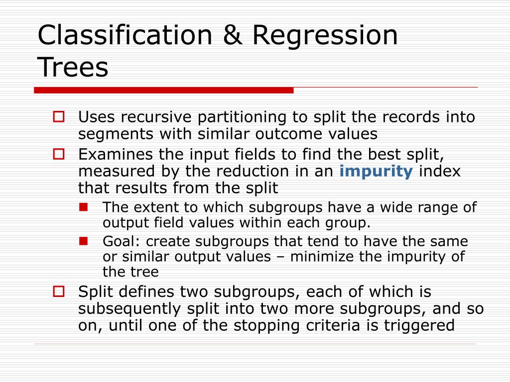 Classification & Regression Trees • Uses recursive partitioning to split the records into segments with similar outcome values • Examines the input fields to find the best split, measured by the reduction in an impurity index that results from the split • The extent to which subgroups have a wide range of output field values within each group. • Goal: create subgroups that tend to have the same or similar output values – minimize the impurity of the tree • Split defines two subgroups, each of which is subsequently split into two more subgroups, and so on, until one of the stopping criteria is triggered