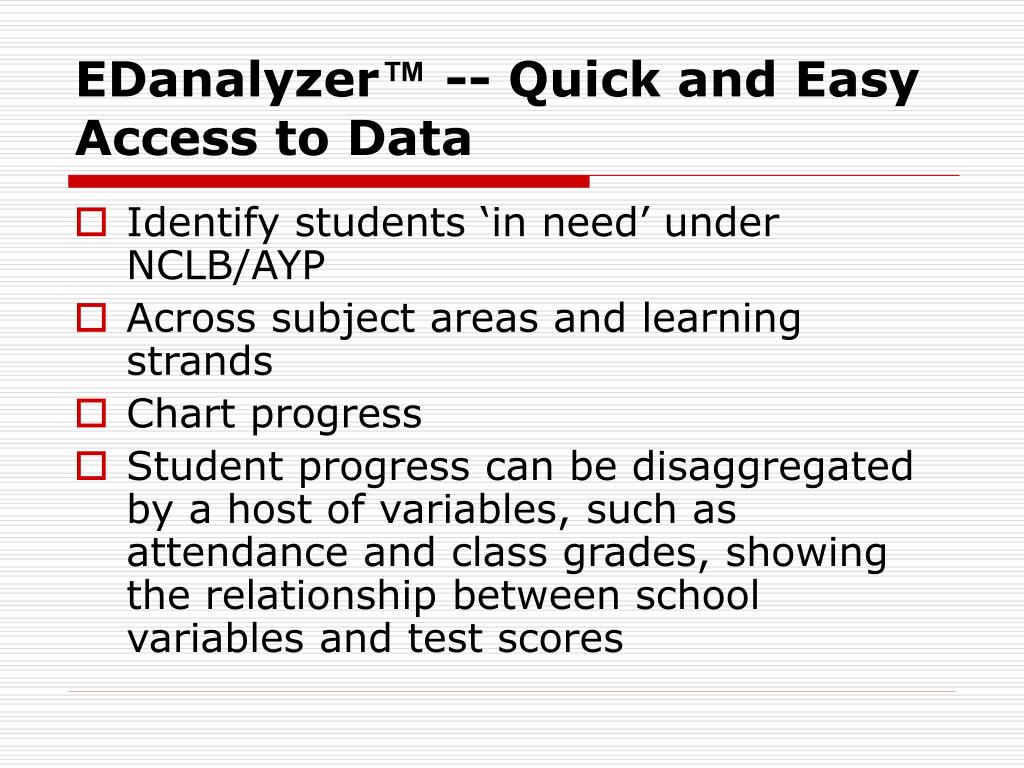 EDanalyzer™ -- Quick and Easy Access to Data • Identify students ‘in need’ under NCLB/AYP • Across subject areas and learning strands • Chart progress • Student progress can be disaggregated by a host of variables, such as attendance and class grades, showing the relationship between school variables and test scores