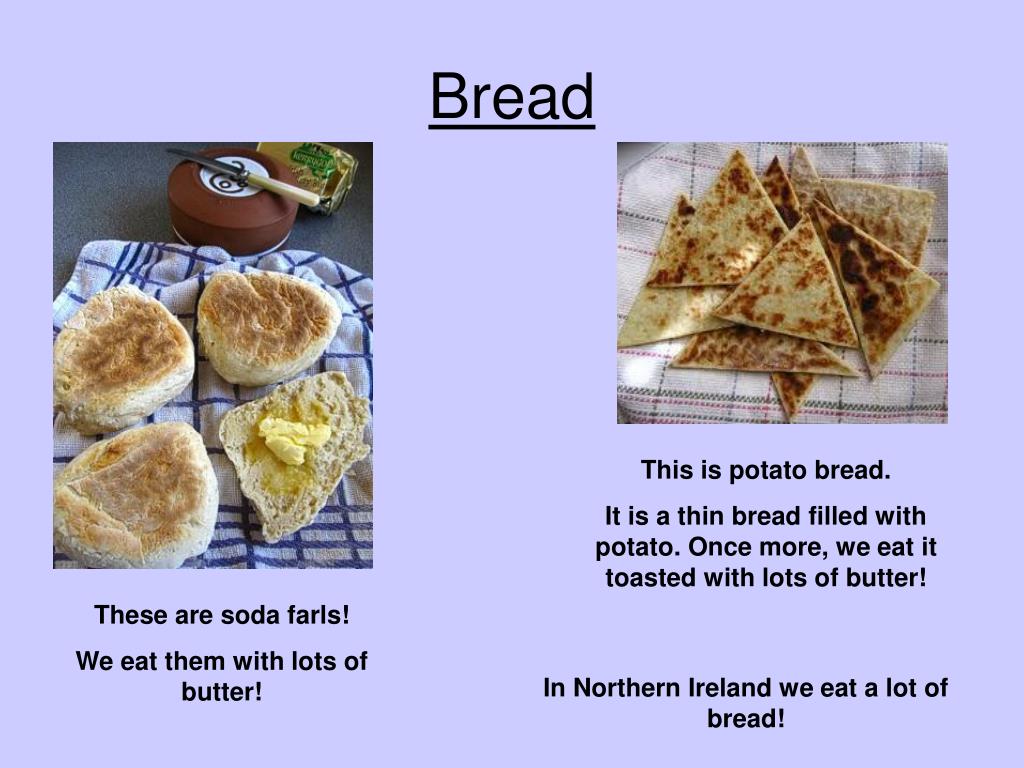 Bread This is potato bread. It is a thin bread filled with potato. Once more, we eat it toasted with lots of butter! These are soda farls! We eat them with lots of butter! In Northern Ireland we eat a lot of bread!