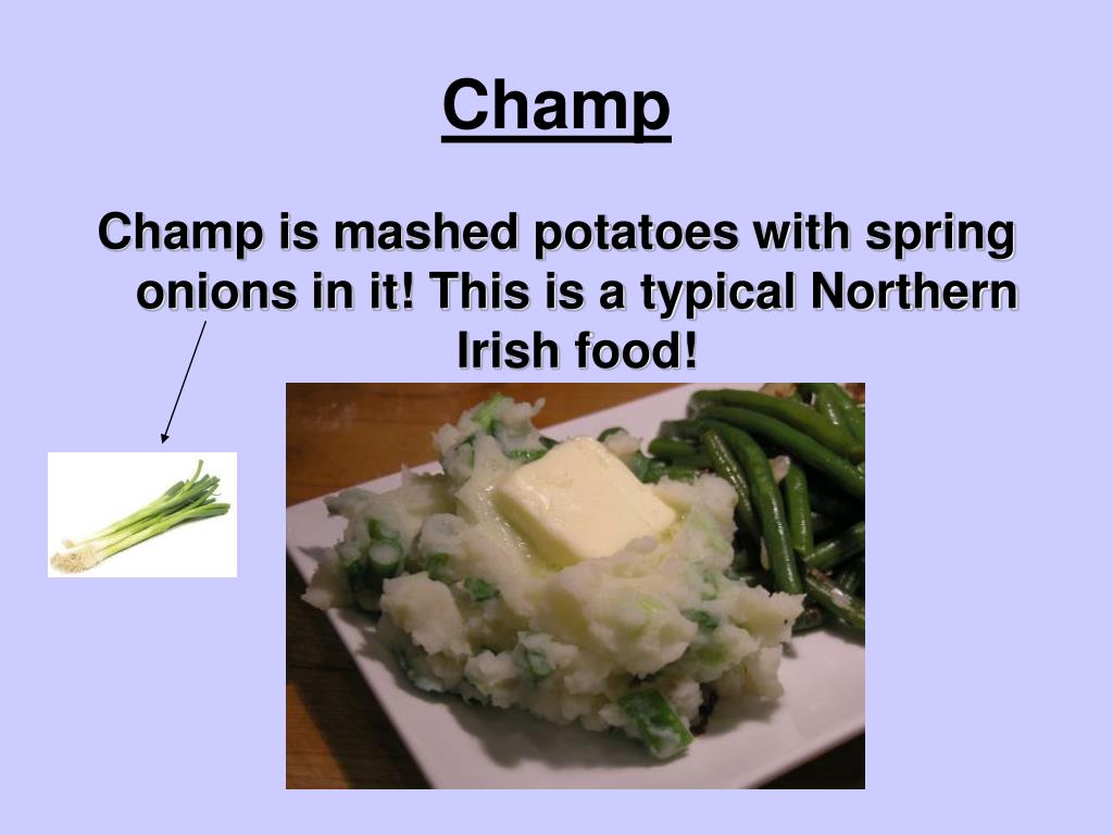 Champ Champ is mashed potatoes with spring onions in it! This is a typical Northern Irish food!