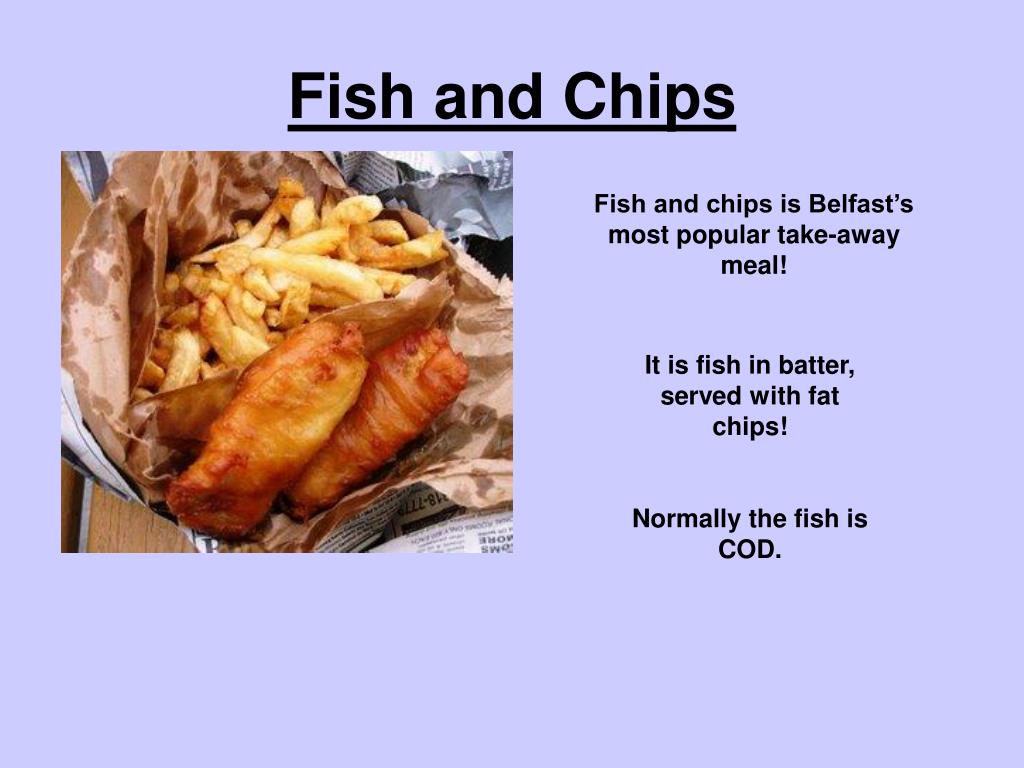 Fish and Chips Fish and chips is Belfast’s most popular take-away meal! It is fish in batter, served with fat chips! Normally the fish is COD.