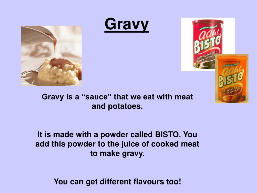 Gravy Gravy is a “sauce” that we eat with meat and potatoes. It is made with a powder called BISTO. You add this powder to the juice of cooked meat to make gravy. You can get different flavours too!