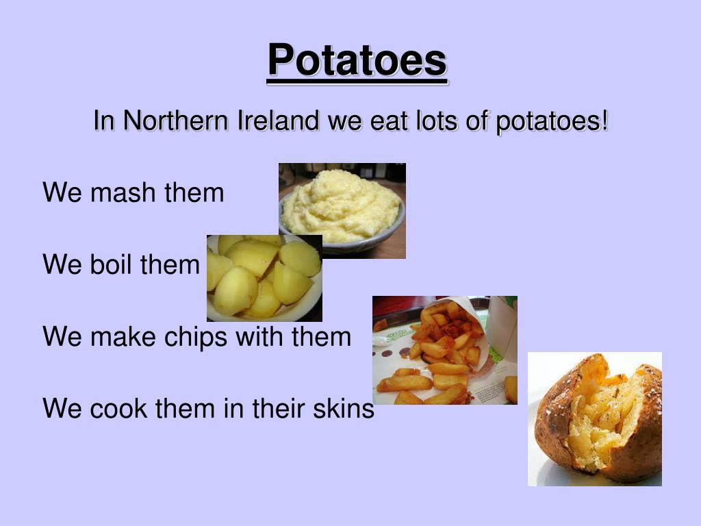 Potatoes In Northern Ireland we eat lots of potatoes! We mash them We boil them We make chips with them We cook them in their skins