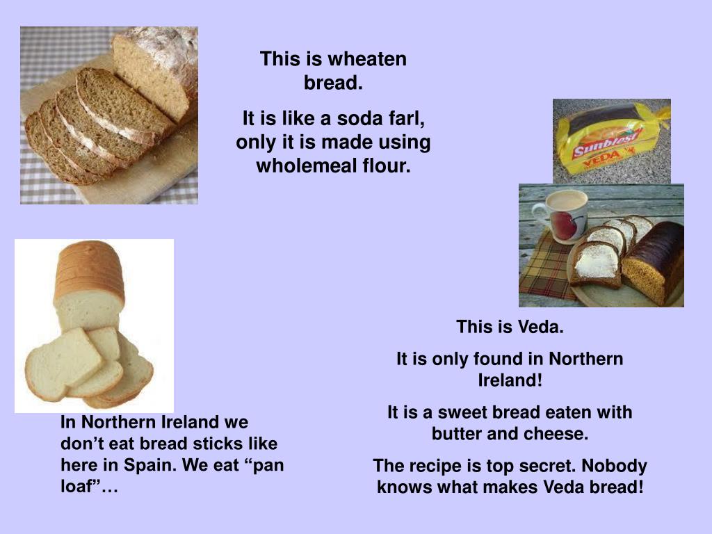 This is wheaten bread. It is like a soda farl, only it is made using wholemeal flour. This is Veda. It is only found in Northern Ireland! It is a sweet bread eaten with butter and cheese. The recipe is top secret. Nobody knows what makes Veda bread! In Northern Ireland we don’t eat bread sticks like here in Spain. We eat “pan loaf”…