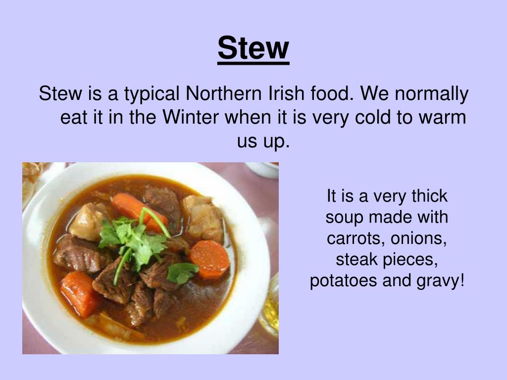 Stew Stew is a typical Northern Irish food. We normally eat it in the Winter when it is very cold to warm us up. It is a very thick soup made with carrots, onions, steak pieces, potatoes and gravy!