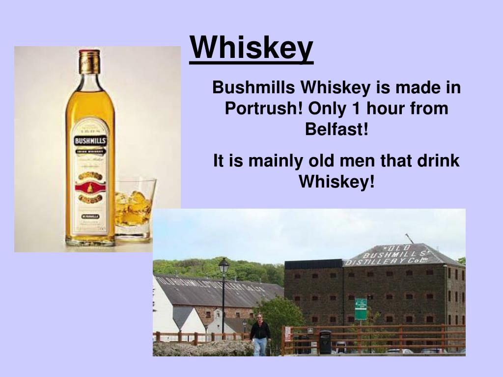 Whiskey Bushmills Whiskey is made in Portrush! Only 1 hour from Belfast! It is mainly old men that drink Whiskey!