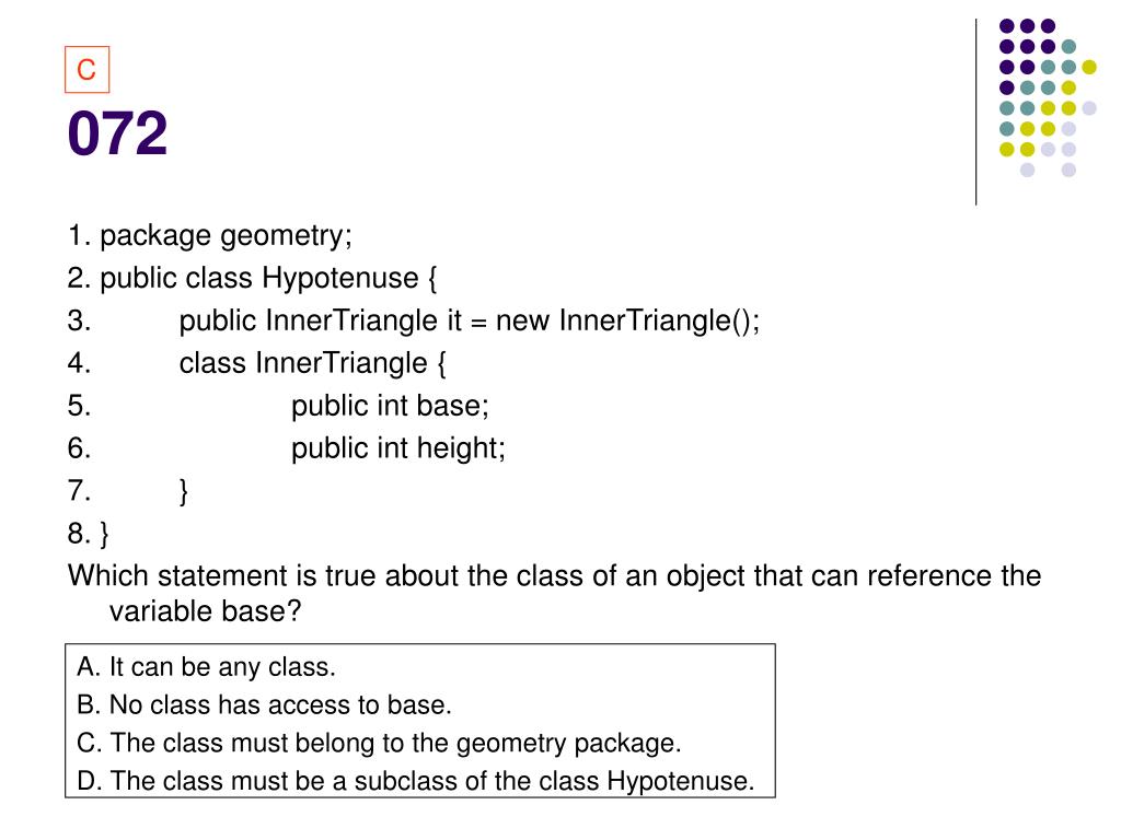 072 C 1. package geometry; 2. public class Hypotenuse { 3. public InnerTriangle it = new InnerTriangle(); 4. class InnerTriangle { 5. public int base; 6. public int height; 7. } 8. } Which statement is true about the class of an object that can reference the variable base? A. It can be any class. B. No class has access to base. C. The class must belong to the geometry package. D. The class must be a subclass of the class Hypotenuse.