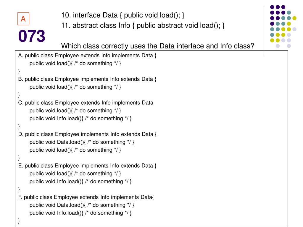 073 A A. public class Employee extends Info implements Data { public void load(){ /* do something */ } } B. public class Employee implements Info extends Data { public void load(){ /* do something */ } } C. public class Employee extends Info implements Data public void load(){ /* do something */ } public void Info.load(){ /* do something */ } } D. public class Employee implements Info extends Data { public void Data.load(){ /* do something */ } public void load(){ /* do something */ } } E. public class Employee implements Info extends Data { public void load(){ /* do something */ } public void Info.load(){ /* do something */ } } F. public class Employee extends Info implements Data{ public void Data.load(){ /* do something */ } public void Info.load(){ /* do something */ } } 10. interface Data { public void load(); } 11. abstract class Info { public abstract void load(); } Which class correctly uses the Data interface and Info class?