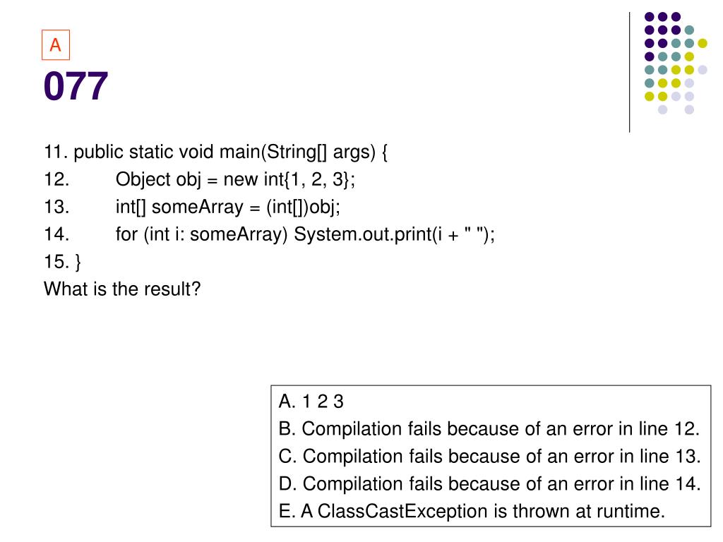 077 A 11. public static void main(String[] args) { 12. Object obj = new int{1, 2, 3}; 13. int[] someArray = (int[])obj; 14. for (int i: someArray) System.out.print(i + " "); 15. } What is the result? A. 1 2 3 B. Compilation fails because of an error in line 12. C. Compilation fails because of an error in line 13. D. Compilation fails because of an error in line 14. E. A ClassCastException is thrown at runtime.