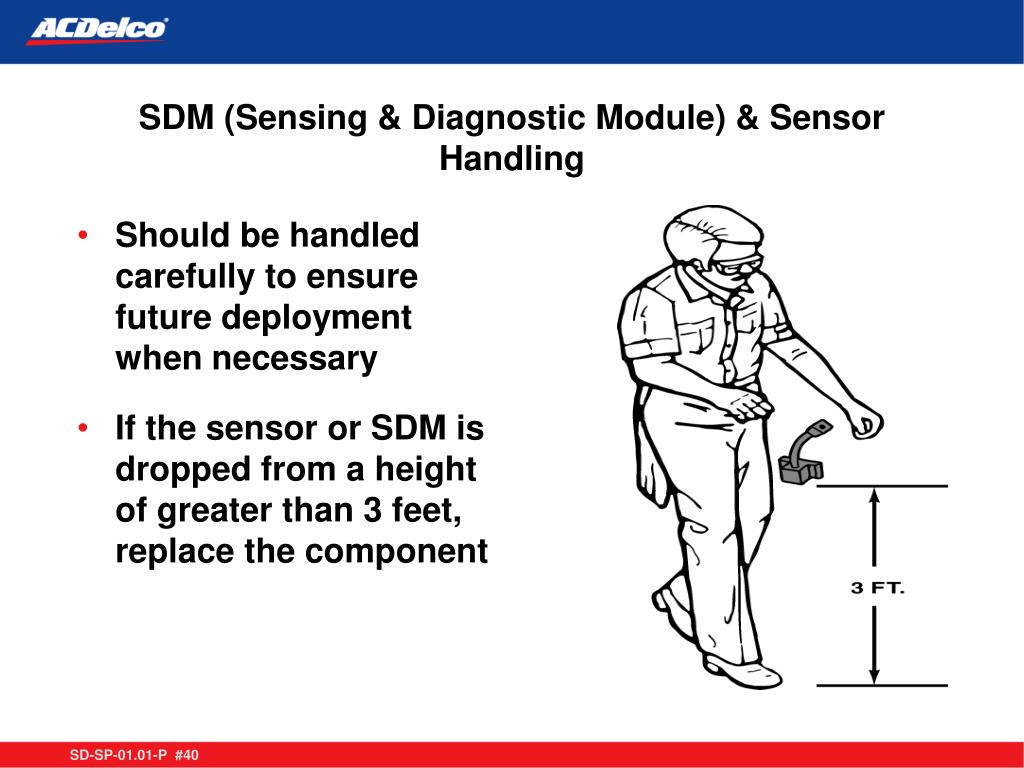 SDM (Sensing & Diagnostic Module) & Sensor Handling • Should be handled carefully to ensure future deployment when necessary • If the sensor or SDM is dropped from a height of greater than 3 feet, replace the component