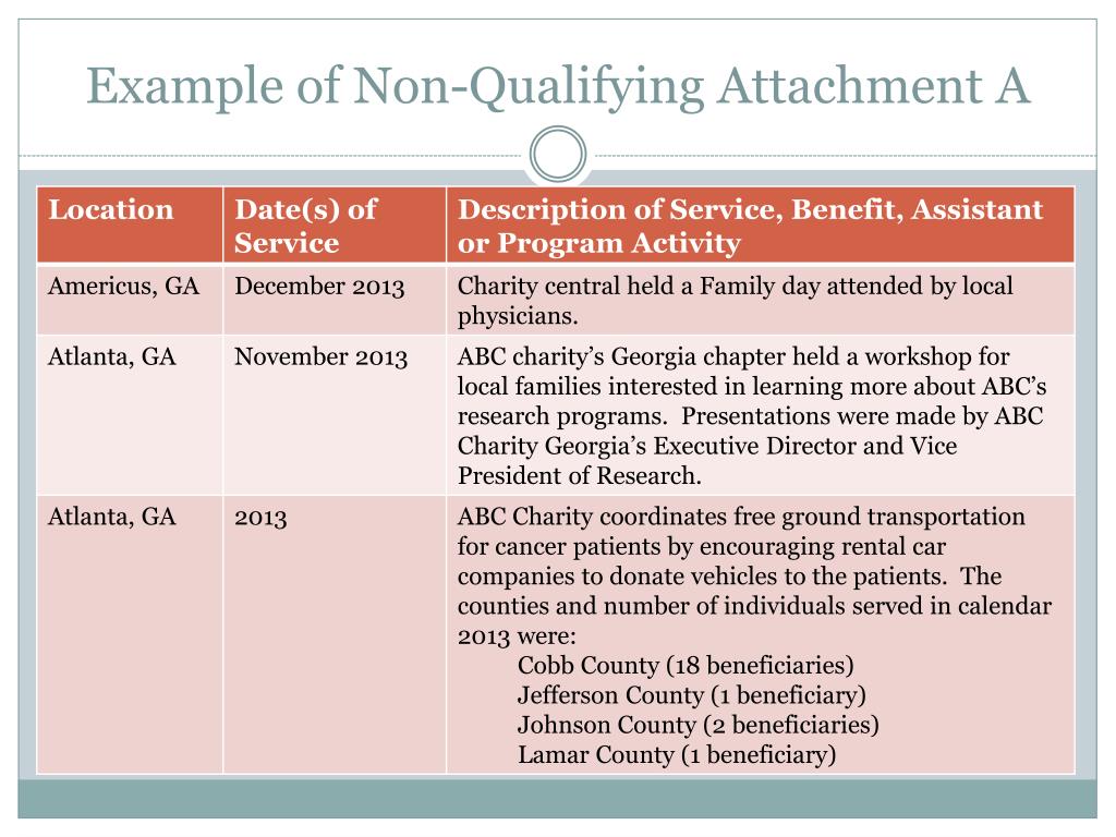 2013 Attachment A • Required schedule of services or benefits should specify: • WHO – indicate the number and type of individuals benefits. • WHAT – services or benefits provided or conducted must include details and specific services. Include quantity, value, scope an impact of services or benefits. • WHERE – specific locations where services or benefits were provided. • WHEN – dates on which service or benefits were provided or conducted during the 2013 calendar year. • Annual reports and brochures will not be accepted.