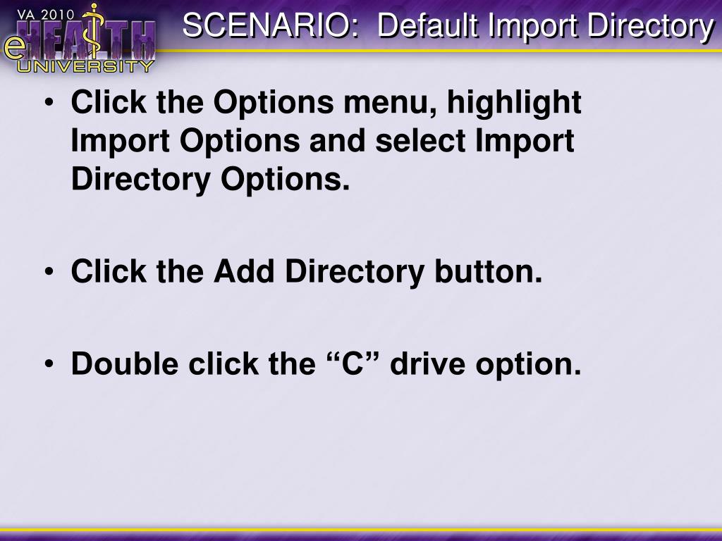 SCENARIO: Default Import Directory • Click the Options menu, highlight Import Options and select Import Directory Options. • Click the Add Directory button. • Double click the “C” drive option.