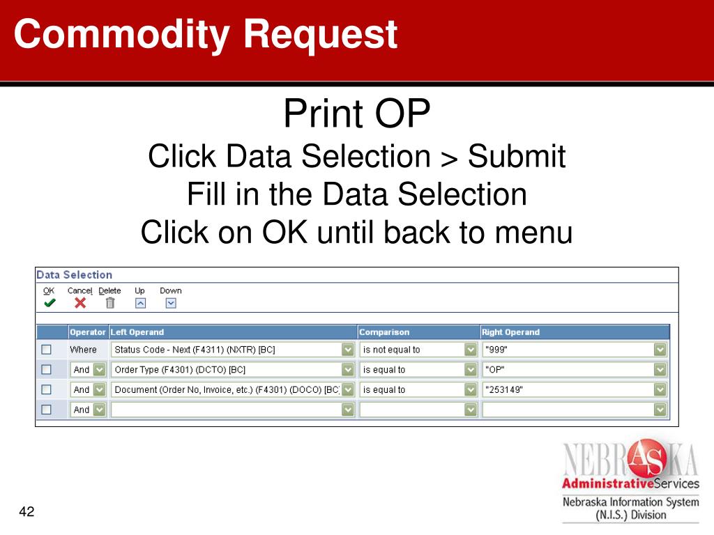 Commodity Request Print OPClick Data Selection > SubmitFill in the Data SelectionClick on OK until back to menu