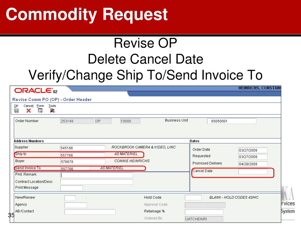 Commodity Request Revise OPDelete Cancel DateVerify/Change Ship To/Send Invoice To