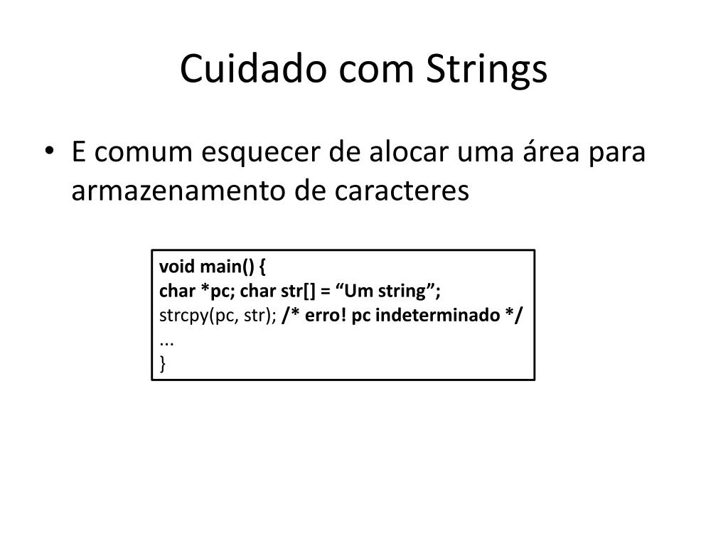 Cuidado com Strings • E comum esquecer de alocar uma área para armazenamento de caracteres voidmain() { char *pc; charstr[] = “Um string”; strcpy(pc, str); /* erro! pc indeterminado */ ... }