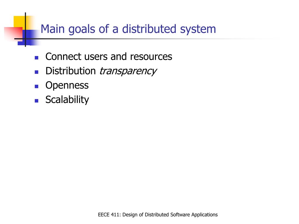 Main goals of a distributed system • Connect users and resources • Distribution transparency • Openness • Scalability EECE 411: Design of Distributed Software Applications