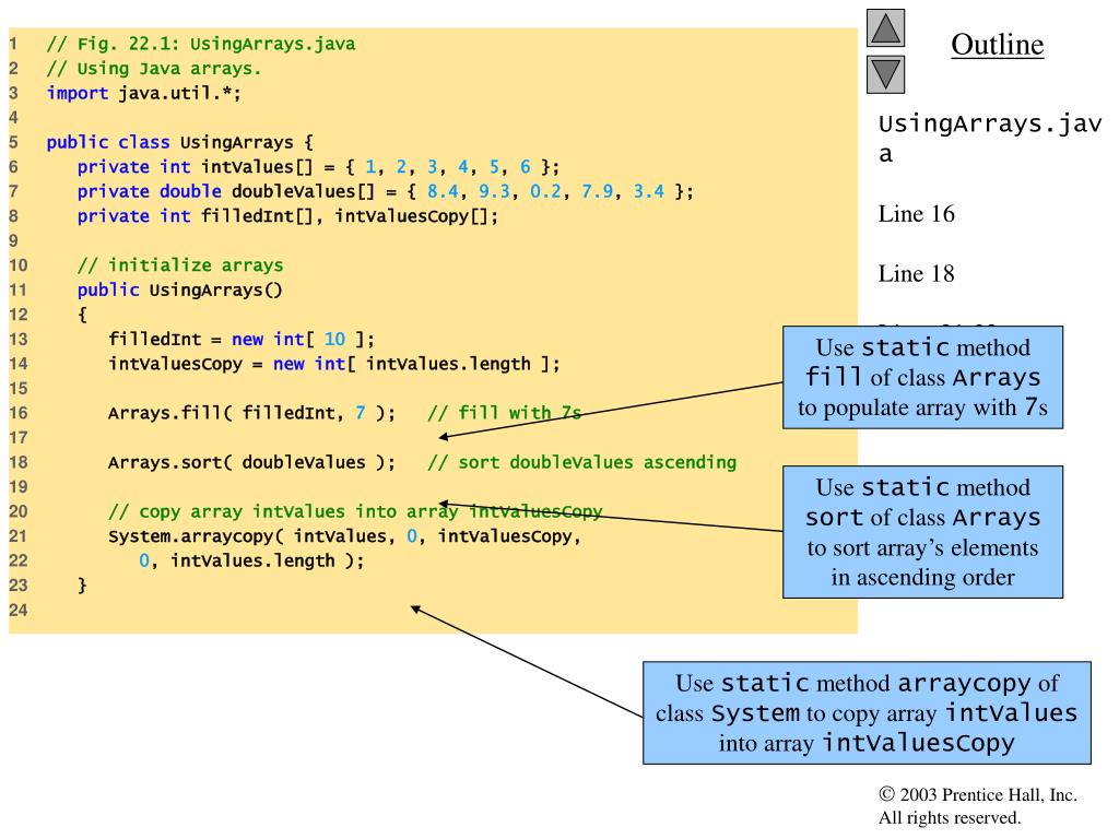 Use static method fill of class Arrays to populate array with 7s Use static method sort of class Arrays to sort array’s elements in ascending order Use static method arraycopy of class System to copy array intValues into array intValuesCopy 1 // Fig. 22.1: UsingArrays.java 2 // Using Java arrays. 3 import java.util.*; 4 5 publicclass UsingArrays { 6 privateint intValues[] = { 1, 2, 3, 4, 5, 6 }; 7 privatedouble doubleValues[] = { 8.4, 9.3, 0.2, 7.9, 3.4 }; 8 privateint filledInt[], intValuesCopy[]; 9 10 // initialize arrays 11 public UsingArrays() 12 { 13 filledInt = newint[ 10 ]; 14 intValuesCopy = newint[ intValues.length ]; 15 16 Arrays.fill( filledInt, 7 ); // fill with 7s 17 18 Arrays.sort( doubleValues ); // sort doubleValues ascending 19 20 // copy array intValues into array intValuesCopy 21 System.arraycopy( intValues, 0, intValuesCopy, 22 0, intValues.length ); 23 } 24 UsingArrays.javaLine 16Line 18Lines 21-22