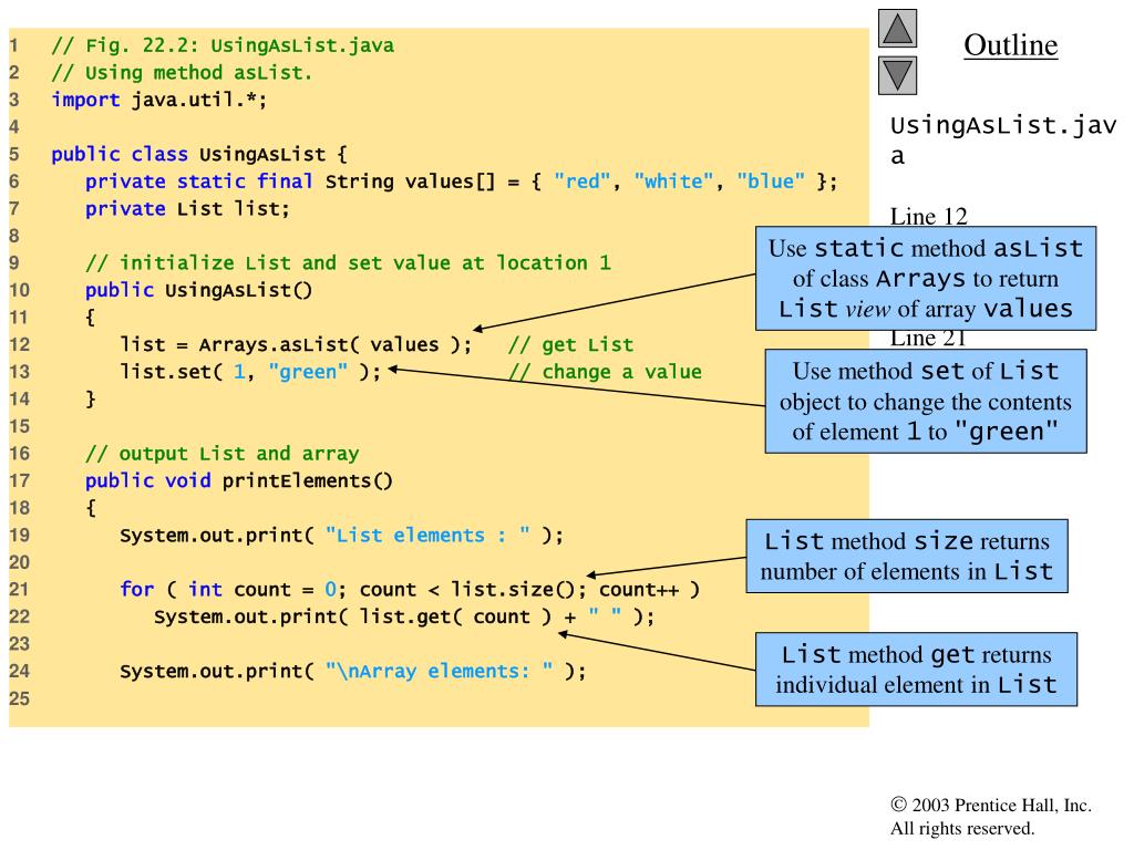 Use static method asList of class Arrays to return Listview of array values Use method set of List object to change the contents of element 1 to "green" List method size returns number of elements in List List method get returns individual element in List 1 // Fig. 22.2: UsingAsList.java 2 // Using method asList. 3 import java.util.*; 4 5 publicclass UsingAsList { 6 privatestaticfinal String values[] = { "red", "white", "blue" }; 7 private List list; 8 9 // initialize List and set value at location 1 10 public UsingAsList() 11 { 12 list = Arrays.asList( values ); // get List 13 list.set( 1, "green" ); // change a value 14 } 15 16 // output List and array 17 publicvoid printElements() 18 { 19 System.out.print( "List elements : " ); 20 21 for ( int count = 0; count < list.size(); count++ ) 22 System.out.print( list.get( count ) + " " ); 23 24 System.out.print( "\nArray elements: " ); 25 UsingAsList.javaLine 12Line 13Line 21Line 22