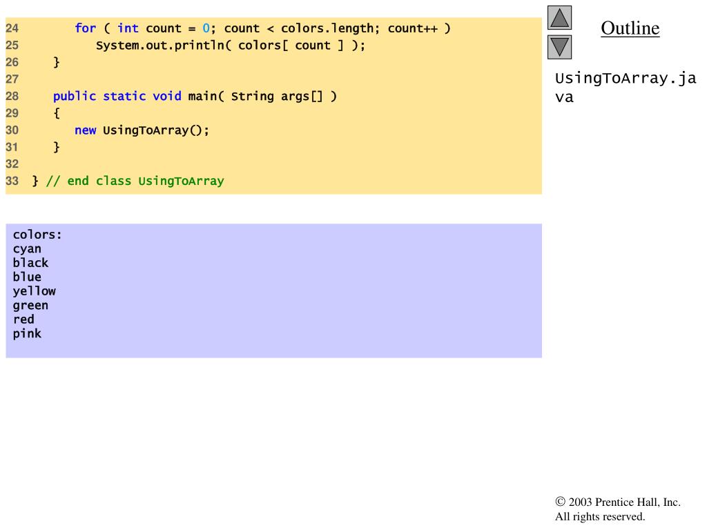 24 for ( int count = 0; count < colors.length; count++ ) 25 System.out.println( colors[ count ] ); 26 } 27 28 publicstaticvoid main( String args[] ) 29 { 30 new UsingToArray(); 31 } 32 33 } // end class UsingToArray UsingToArray.java colors: cyan black blue yellow green red pink