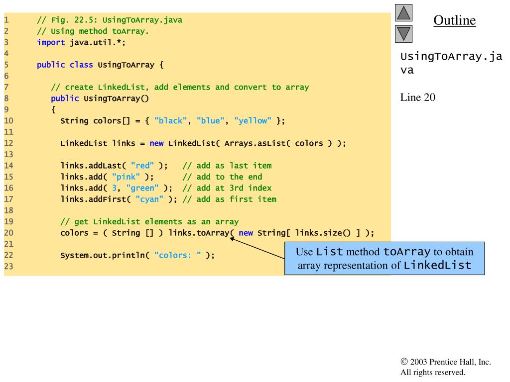 Use List method toArray to obtain array representation of LinkedList 1 // Fig. 22.5: UsingToArray.java 2 // Using method toArray. 3 import java.util.*; 4 5 publicclass UsingToArray { 6 7 // create LinkedList, add elements and convert to array 8 public UsingToArray() 9 { 10 String colors[] = { "black", "blue", "yellow" }; 11 12 LinkedList links = new LinkedList( Arrays.asList( colors ) ); 13 14 links.addLast( "red" ); // add as last item 15 links.add( "pink" ); // add to the end 16 links.add( 3, "green" ); // add at 3rd index 17 links.addFirst( "cyan" ); // add as first item 18 19 // get LinkedList elements as an array 20 colors = ( String [] ) links.toArray( new String[ links.size() ] ); 21 22 System.out.println( "colors: " ); 23 UsingToArray.javaLine 20